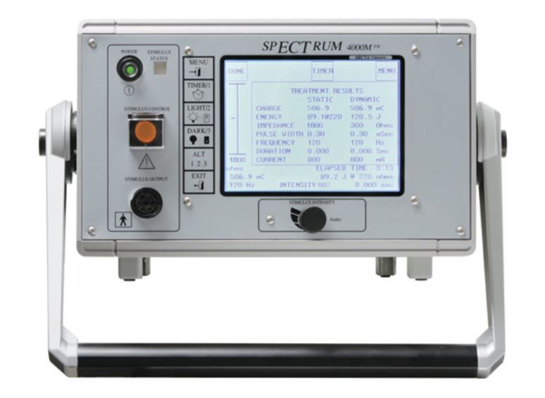 Este spECTrum 4000M, reprojetado, econômico e leve, oferece simplicidade na dosagem com somente um Botão de Intensidade de Estímulo. Com isso, varia-se Frequência e Duração simultaneamente para controlar Energia e Carga. Para aqueles acostumados a um único botão de estímulo, o modelo 4000M é a melhor opção em flexibilidade na dosagem, enquanto retém parâmetros que maximizam a eficácia e reduzem efeitos colaterais para o paciente. As configurações de largura de pulso e tabelas de titulação spECTrum ULTRABRIEF© (0.3 ms) são inclusas em todos os dispositivos MECTA.